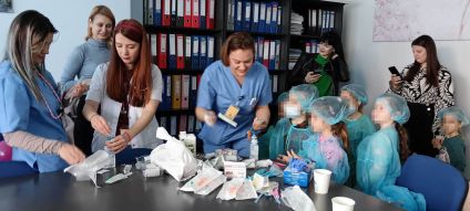 Dr. Mihaela Guțu, medic specialist pediatru, le-a arătat celor mici cum se face o injecție, cum se ia tensiunea arterială și a organizat mici experimente medicale educative.