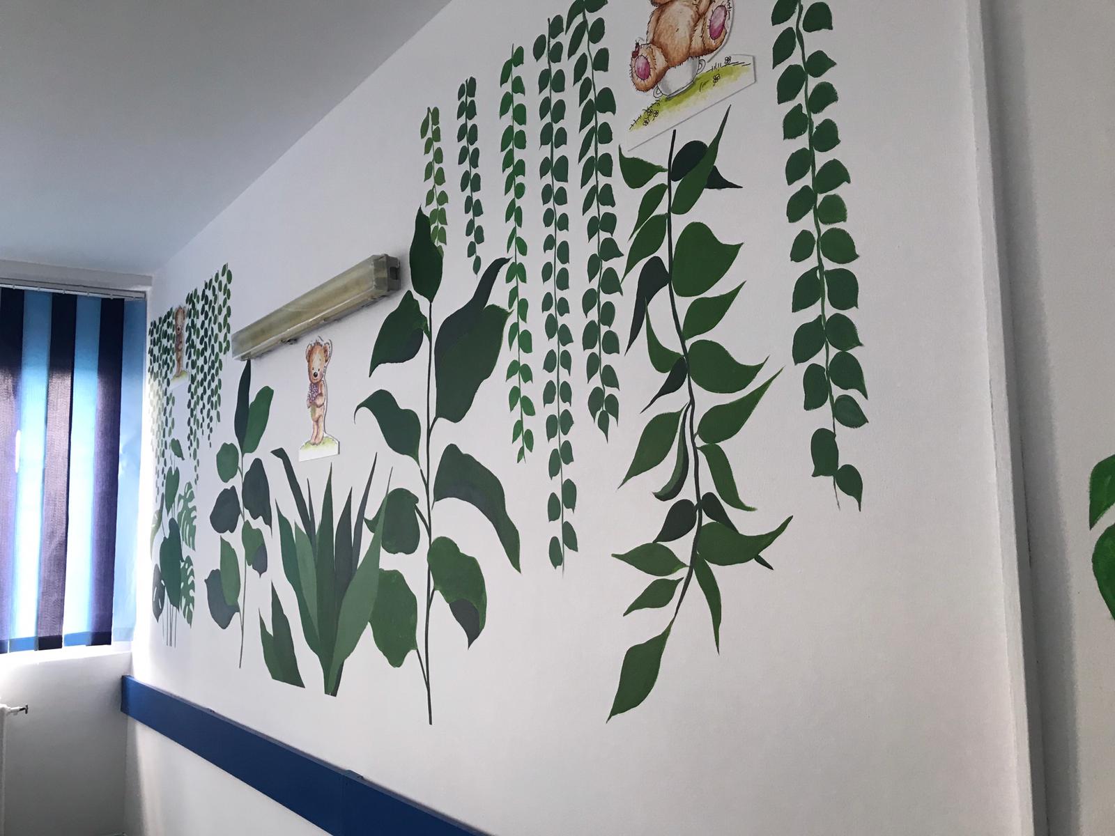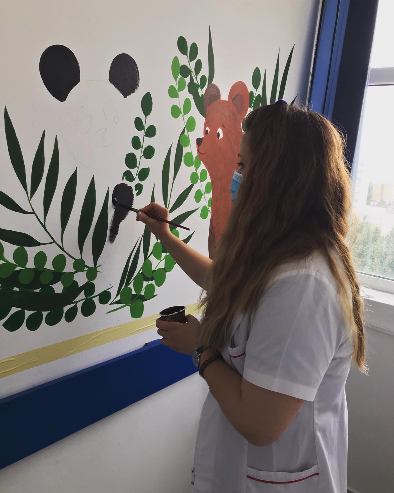 Andreea Zaleschi, masterand Universitatea Națională de Arte Iași: „Am rezonat cu propunerea celor de la Spitalul Județean de Urgență Buzău de a picta pereții saloanelor din secția Pediatrie. Pentru mine, acest proiect a însemnat atât un joc artistic, cât și o provocare, fiindcă, pe lângă pensule și acrilice, lucrăm cu emoțiile, le transpunem vizual pentru a fi primite de cei care le observă, dăm viață poveștilor, le ducem mai departe, împânzim diverse locuri cu imagini care să creeze stări de bine. Iar asta presupune multă grijă și atenție. Venit din suflet/inimă pentru alte mici suflețele, pictura murală de la Pediatrie a însemnat o pânză de emoții țesută din povestioare dragi copilăriei mele, cu personaje vesele și compoziții animate, dar și multă voie bună și zâmbete, toate acestea din dorința de a colora starea celor mici care ajung pe holurile secției Pediatrie.