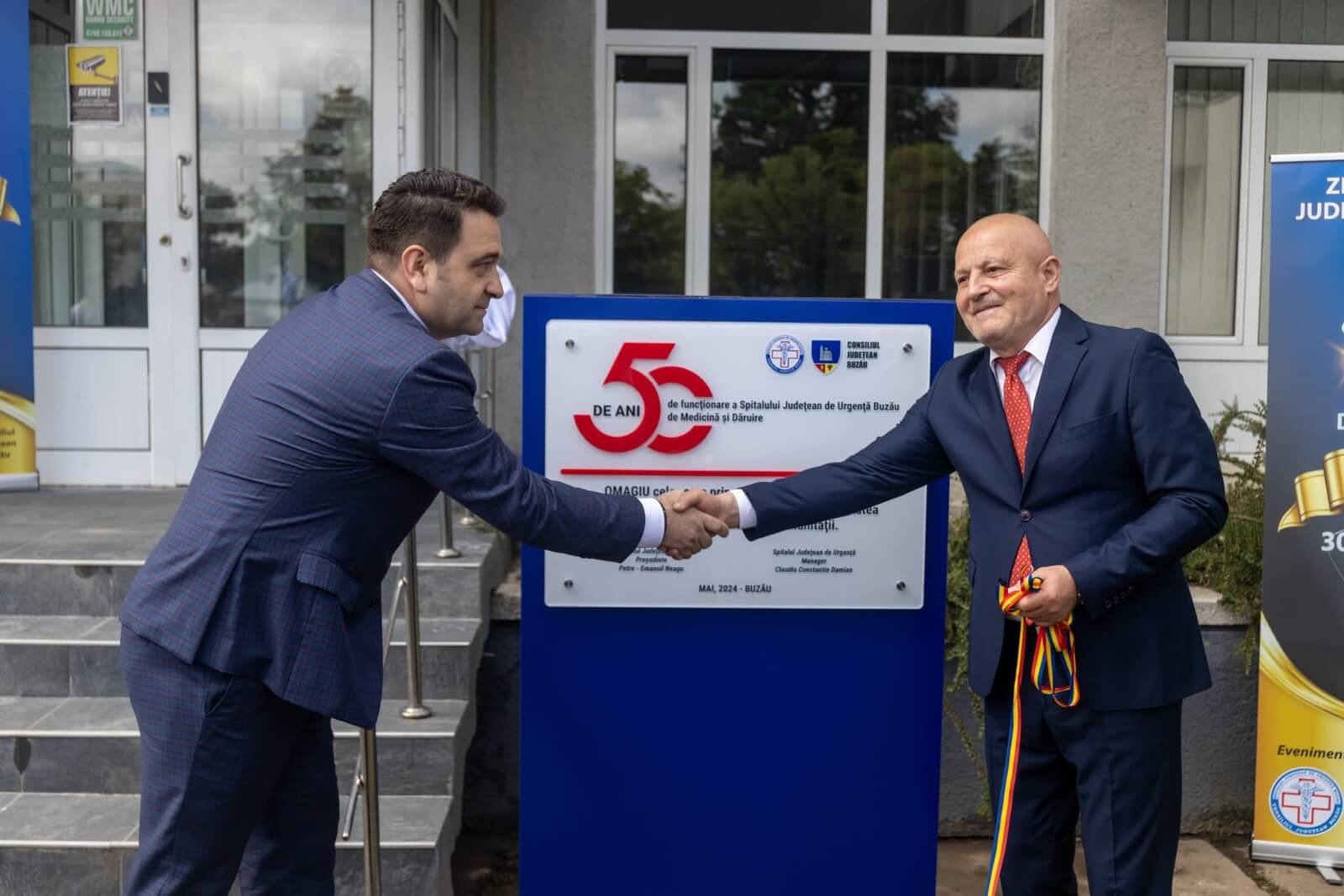 După deschiderea oficială a manifestărilor, la sediul Spitalului Județean de Urgență Buzău a avut loc un alt moment emoționant, dezvelirea unei plăci comemorative ce marchează cei 50 de ani de funcționare a S.J.U. Buzău, un omagiu adus celor care au asigurat și asigură continuitatea acestei unități medicale, în slujba comunității.