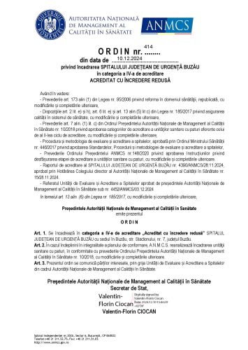 Cerificat de Acreditare Seria: ANMCS nr. 2-480 valabil până la 9.12.2029 - Certificat emis pentru ciclul II de acreditare